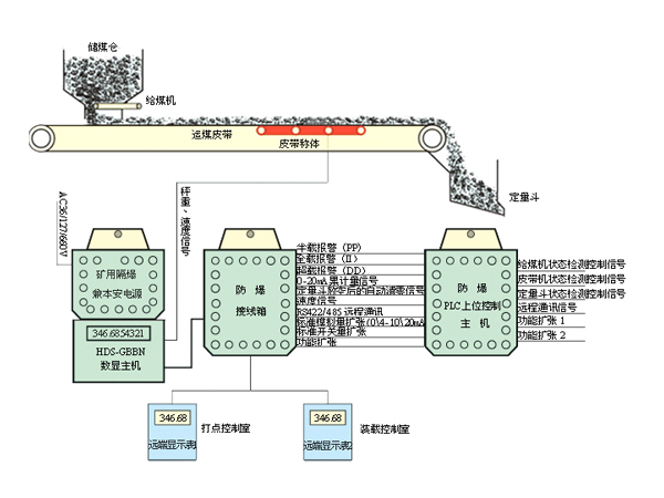 系統設備組成:礦用電子皮帶秤秤體、稱重傳感器、礦用電子皮帶秤數顯分機、定量裝載型控制接線箱、本安型遠端裝載量顯示表系統特點及功能實現:1、 可對主井提升箕斗裝煤量進行定量控制:(PP、II、dd量值可在現場憑密碼 任意設定)2、 可采用通訊、模擬量、開關量等方式向主井裝載信號控制系統發送實時裝載量,主井信號控制系統PLC主機采集裝載信號后,按一定的程序對整個裝載過程(定量斗、給煤機、皮帶)進行安全有效的控制。3、 對定量斗裝煤量進行有效的監控,以免定量斗因故障引起提升箕斗機超、欠載運行,同時起到定量斗裝載的前端保護,保障主井提煤系統安全可靠的運行。4、 通過累計裝載次數,可準確計量出整個煤礦班、日、月 年的產煤量。5、 定量裝載礦用電子皮帶秤安裝在裝載皮帶上,比較靠近甲帶給煤機附近,在給箕斗定量裝載時最先獲取準確裝載量,并將裝載量及時反饋給上位PLC信號控制系統,主井信號控制系統對裝載用的甲帶給煤機停止信號,完成整個箕斗定量裝載過程。在整個裝載信號控制系統過程中,定量裝載礦用電子皮帶秤也可以自行控制甲帶給煤機的啟停狀態。6、 預留遠程通訊接口和技術支持,以便產品更好的升級。